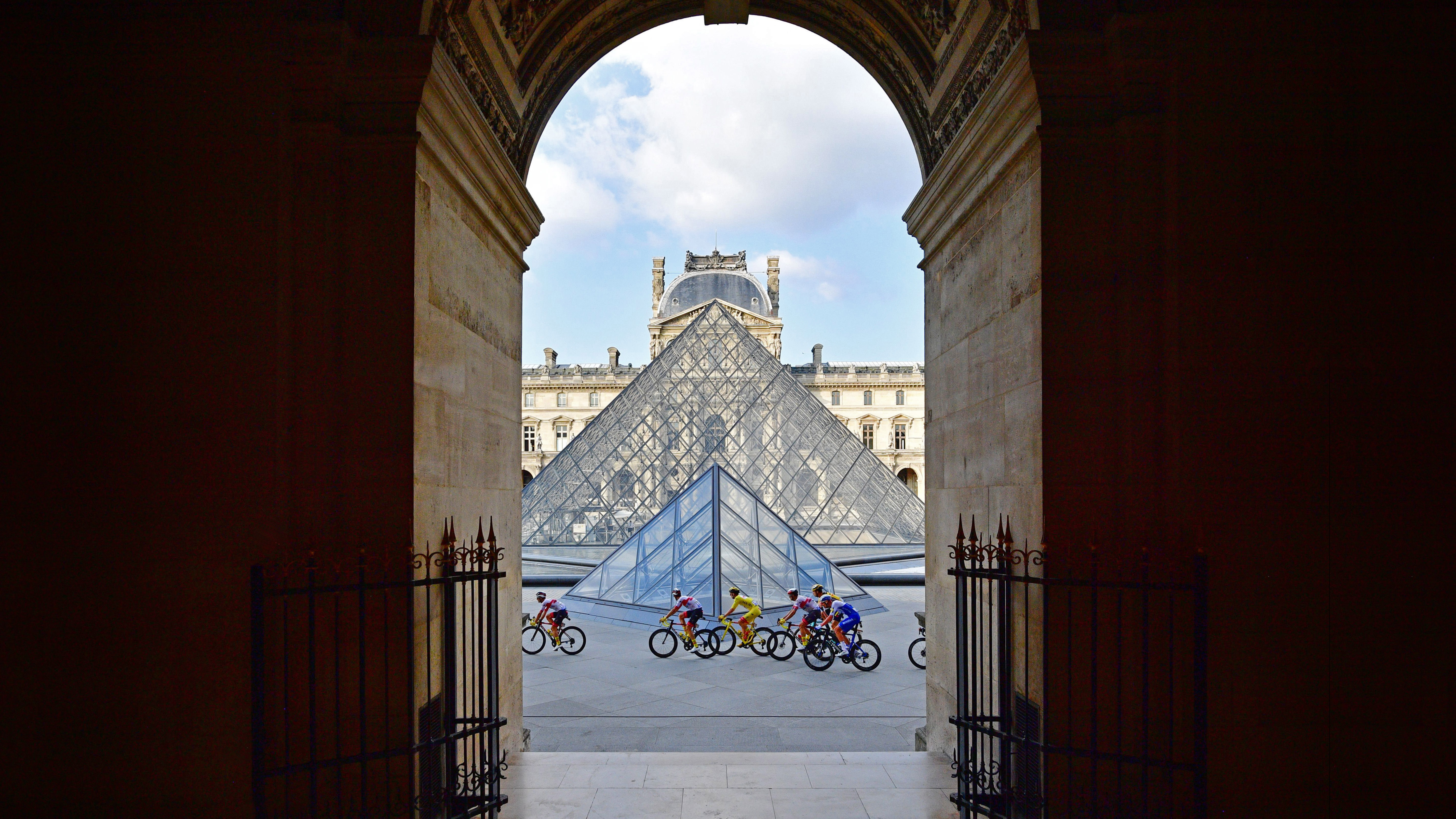 Tour de 法国 riders in front of the Louvre Pyramid and Museum in 巴黎, 法国, during the 2020 race (© Martin Bureau/AFP via 盖蒂图片社)